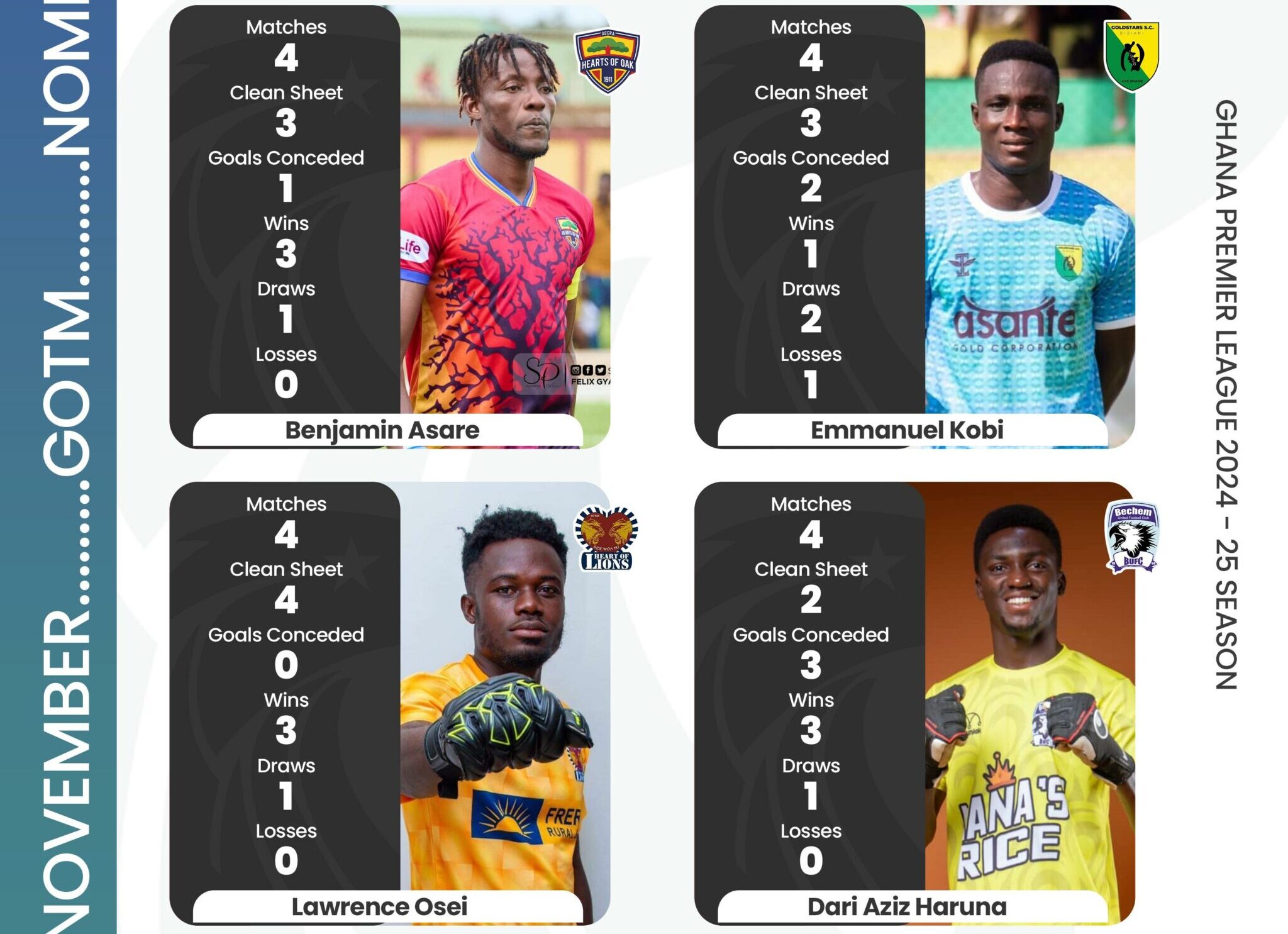 - Lawrence Osei (Kpando Heart of Lions), who impressively secured 4 clean sheets in consecutive matches, maintaining an unbeaten record with 3 wins and 1 draw.