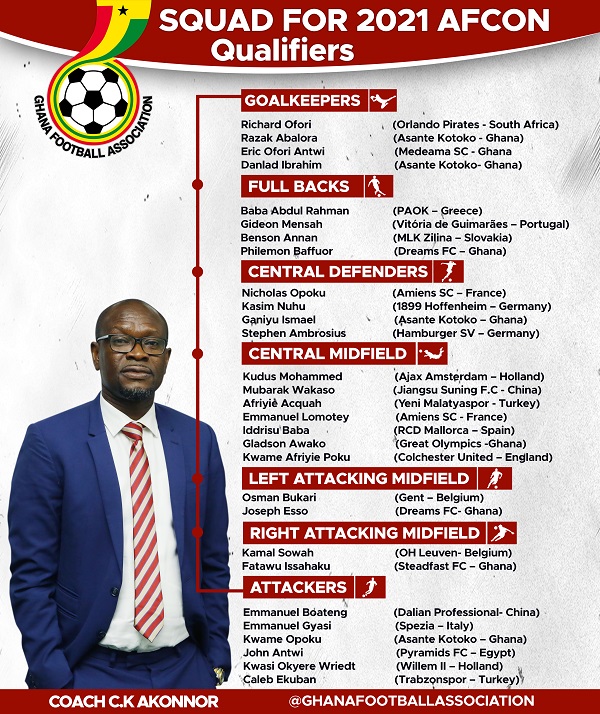 Black Stars Head Coach C. K Akonnor has named a 29-man squad for the 2021 Africa Cup of Nations qualifiers against South Africa and Sao Tome and Principe. The team is a mixture of home-based and others who play abroad.