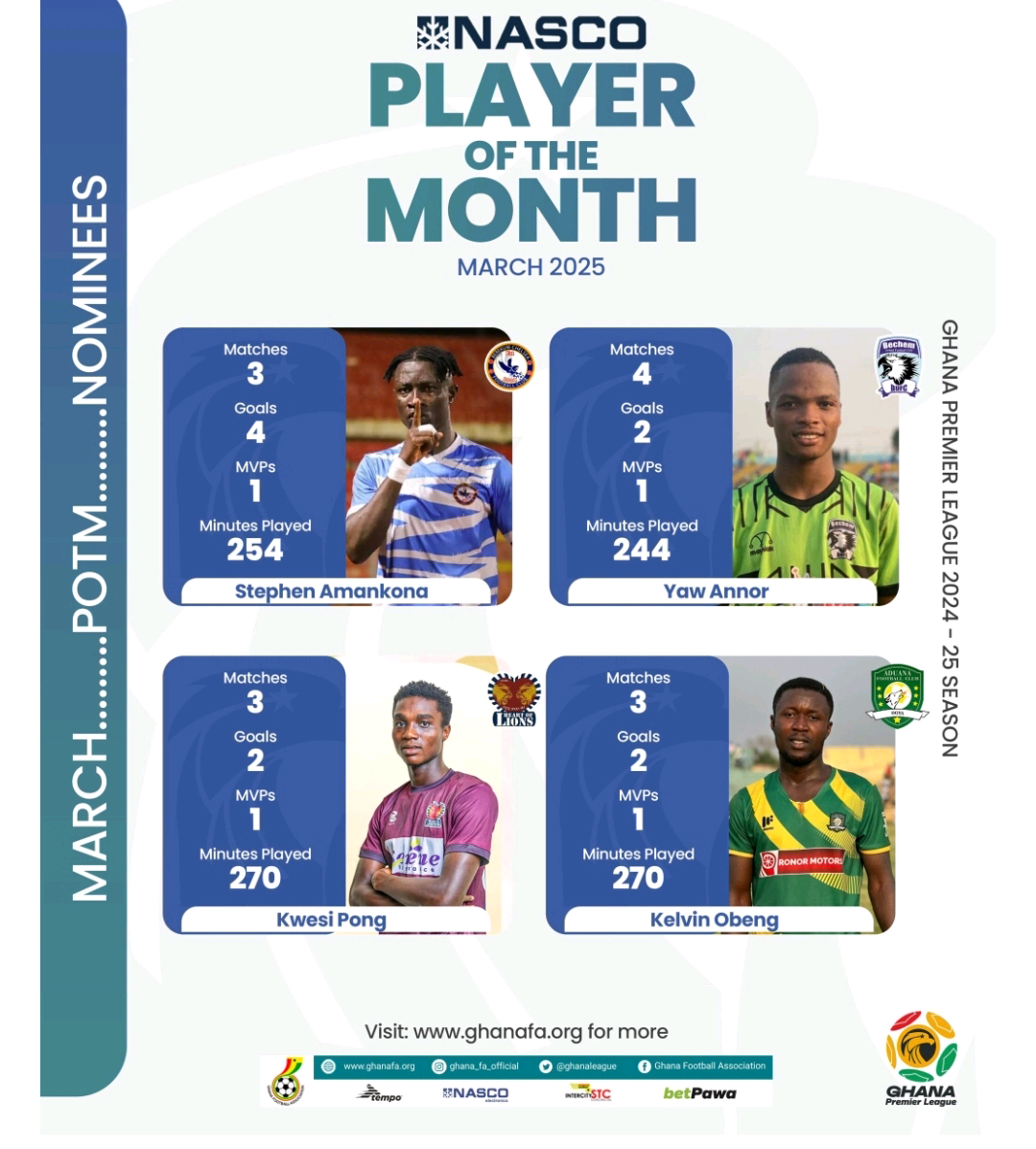 The race for the NASCO Player of the Month award for March promises to be intense, as four standout performers are in contention following impressive displays in the Ghana Premier League.