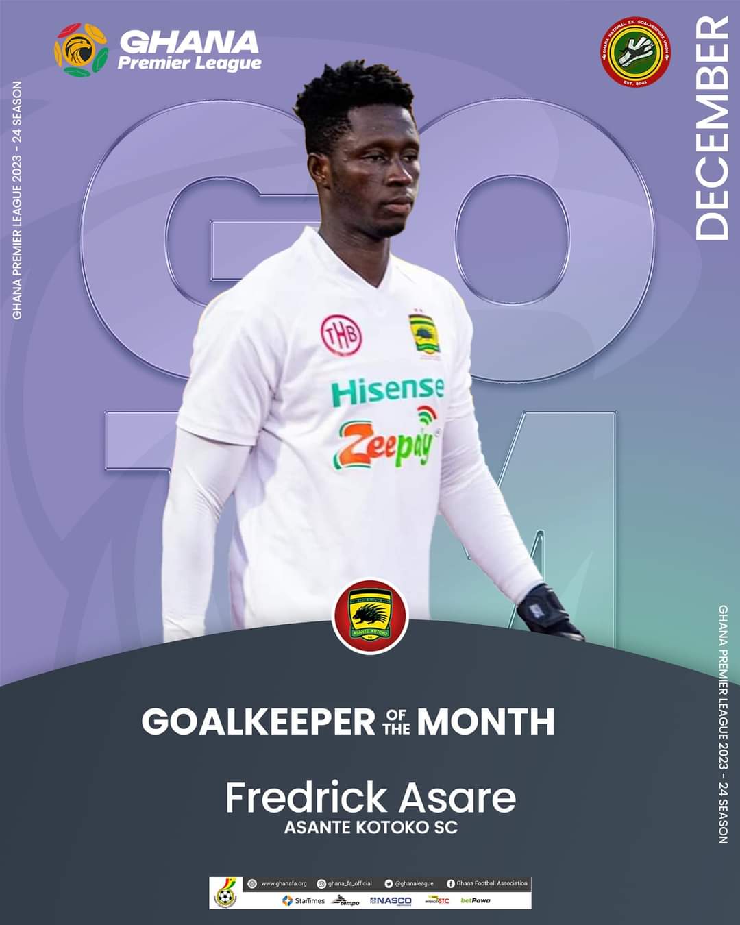 Asante Kotoko’s goalkeeper, Fredrick Asare, has been honored with the Ghana National Ex. Goalkeepers Union Award for December.