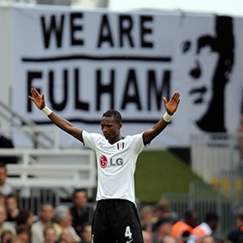 John Pantsil prays with his arms out-stretched in front of a giant "We Are Fulham" banner