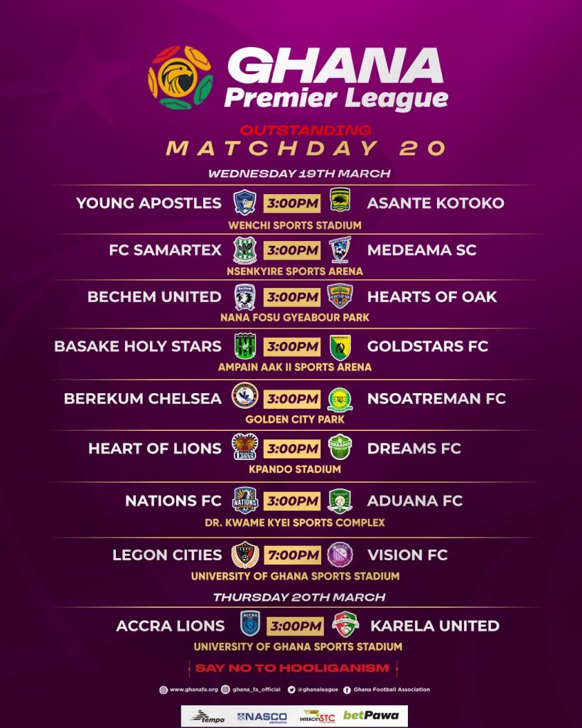 After the break, the league resumed with matchday 23, followed by matchday 24, which concluded this past weekend. To bring the schedule back on track, the Ghana Football Association (GFA) has now set the outstanding matchday 20 fixtures for Wednesday.