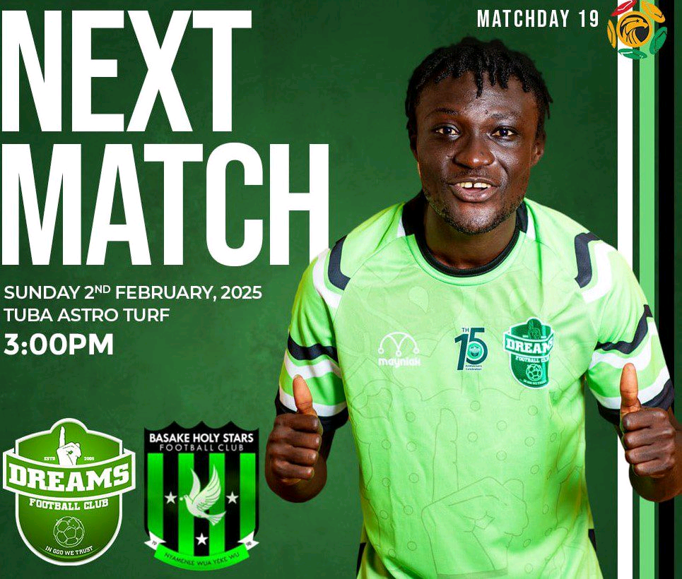 Dreams FC will face off against Premier League newcomers Basake Holy Stars at the Tuba Astro Turf on Sunday, February 2, 2025, in a must-win clash for both sides.