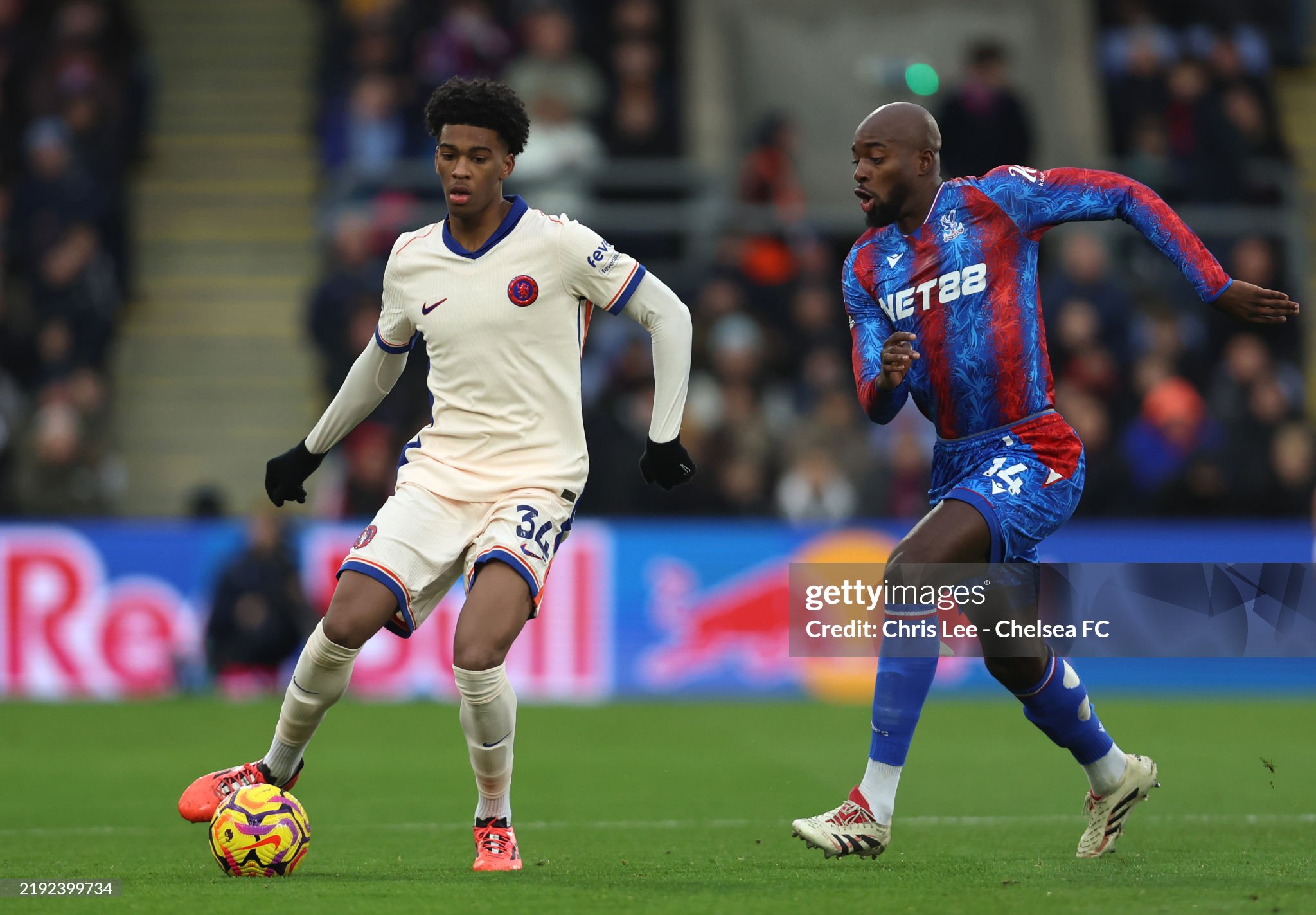 LONDON, ENGLAND - JANUARY 04: Josh-Kofi Acheampong of Chelsea runs with the ball whilst under pressure from Jean-Philippe Mateta of Crystal Palace during the Premier League match between Crystal Palace FC and Chelsea FC at Selhurst Park on January 04, 2025 in London, England. (Photo by Chris Lee - Chelsea FC/Chelsea FC via Getty Images)