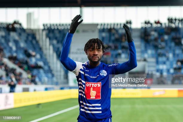 LAUSANNE, SWITZERLAND - FEBRUARY 27: Asumah Abubakar #21 of FC Luzern celebrates his goal with fans during the Swiss Super League match between FC Lausanne-Sport and FC Luzern at Stade de la Tuiliere on February 27, 2022 in Lausanne, Switzerland. (Photo by RvS.Media/Basile Barbey/Getty Images)