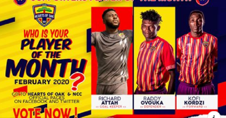 Inform Goalkeeper Richard Attah, Raddy Ovouka and striker Kofi Kordzi have been nominated for Hearts of Oak Fans player of the Month for the month of February.
