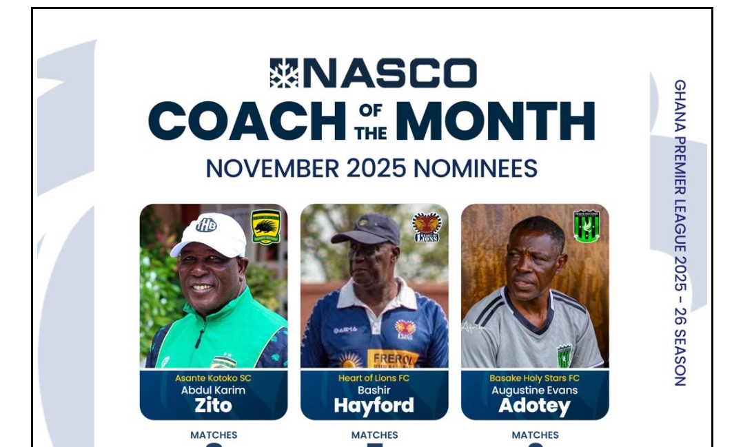 Three coaches have earned nominations for the NASCO Coach of the Month award for November after guiding their teams to strong and eye-catching performances. The contenders are Asante Kotoko’s Abdul Karim Zito, Heart of Lions head coach Bashir Hayford, and Basake Holy Stars manager Augustine Evans Adotey.