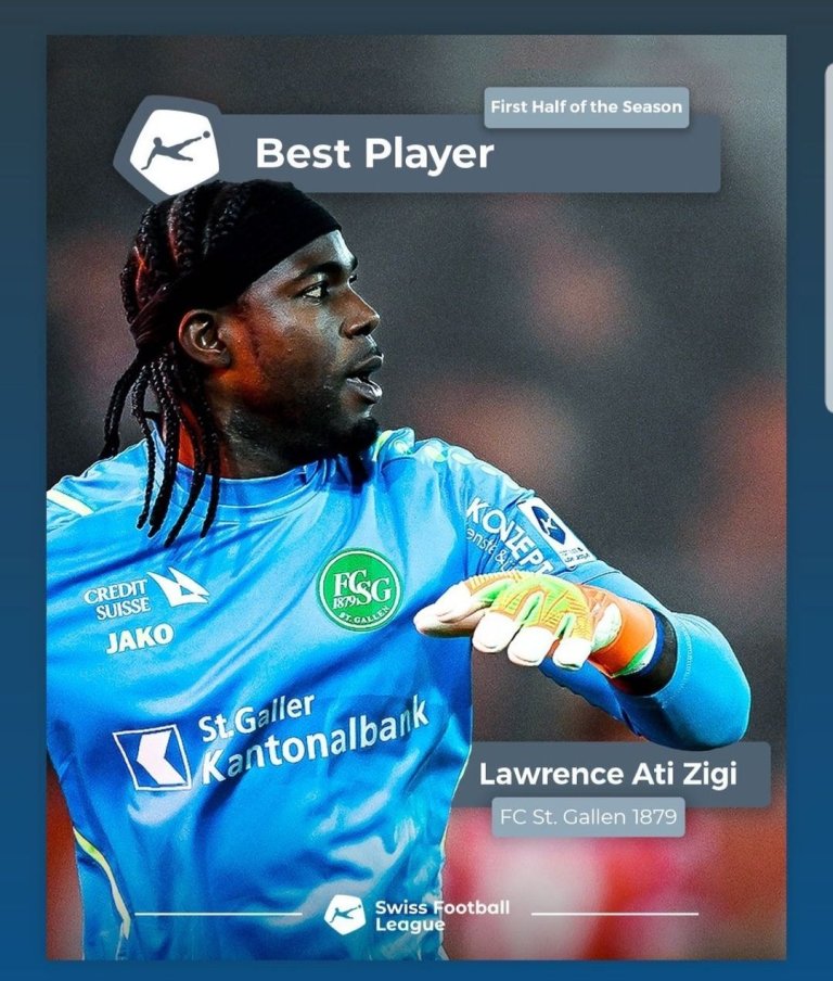 Ghanaian goalkeeper Lawrence Ati Zigi has been named the best player in the Swiss League for the first half of the season.