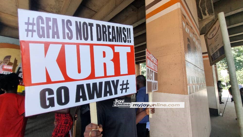 Some of the placards displayed messages such as “Kurt go away,” “Football is not politics,” “FIFA and CAF must speak now,” and “Sports Minister act now.”