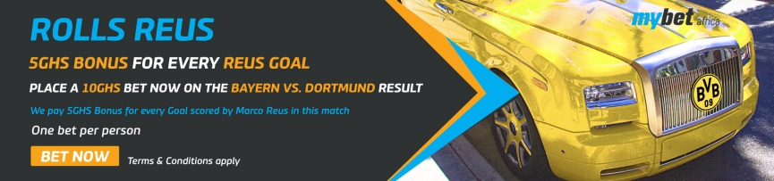 Mybet is offering 5GHs refund bonus for each goal scored by their favourite player “Roll Reus” in this epic match. That is for any customer who places a minimum bet of 10GHs on the match.
